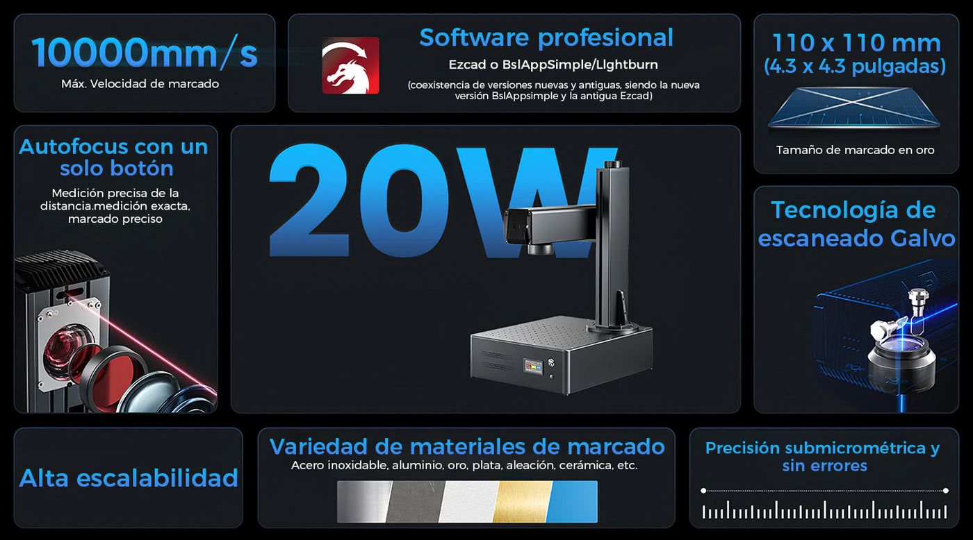 La máquina de marcado por láser de fibra Monport GA ofrece un tamaño de trabajo de 110x110 mm (4,3x4,3 pulg.), ideal para un marcado y grabado precisos. Este tamaño permite una eficacia de marcado óptima en una gran variedad de materiales, incluidos metales como el acero inoxidable y el aluminio.