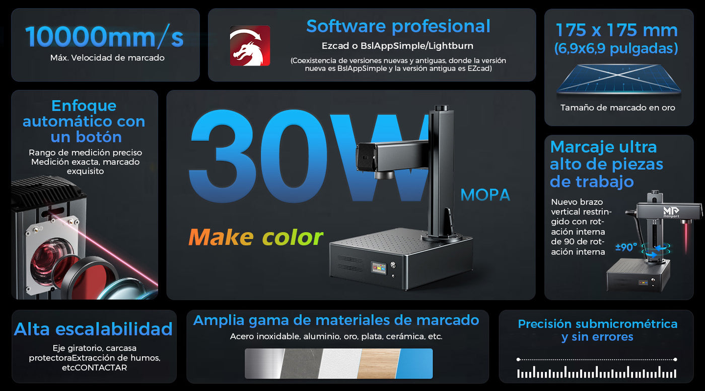 | Tipo de láser | Láser de fibra MOPA | Láser de fibra MOPA | Láser de fibra MOPA |