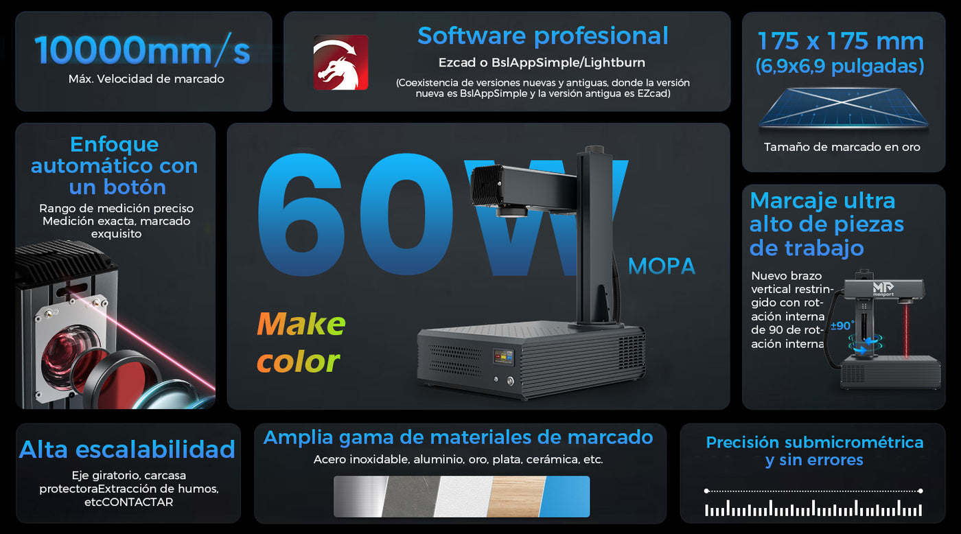 | Tipo de láser | Láser de fibra MOPA | Láser de fibra MOPA | Láser de fibra MOPA |