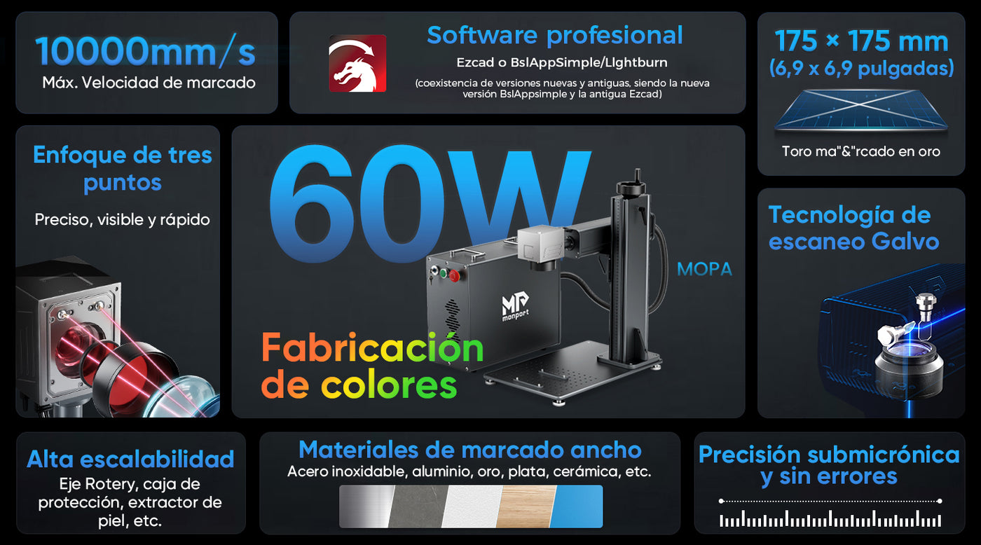 | Tipo de láser | Láser de fibra MOPA | Láser de fibra MOPA | Láser de fibra MOPA | Láser de fibra MOPA |