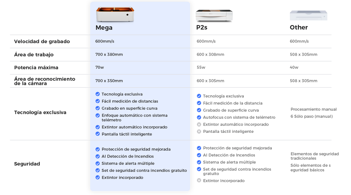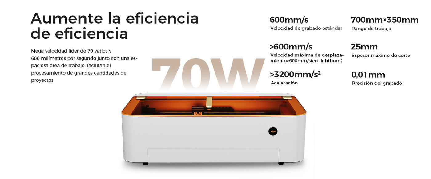 | Contenido del paquete | Láser de Co2 de 70 W *1 Acrílico transparente de 3 mm *2 Paneles de madera de cal de 3 mm *5 Papel kraft *10 Manguera y abrazadera para canal de aire *1 1 litro de anticongelante *1 Adaptador para canal de aire *1 Cable de red *1 Cable USB tipo C *1 Dispositivo óptico de puntería *1 Juego de destornilladores *1 Embudo *1 Juego de abrazaderas de fijación *1 Juego de llaves hexagonales *1 Cintas tejidas *2 Tarjetas de visita *5 Manual de usuario de Mega *1 |